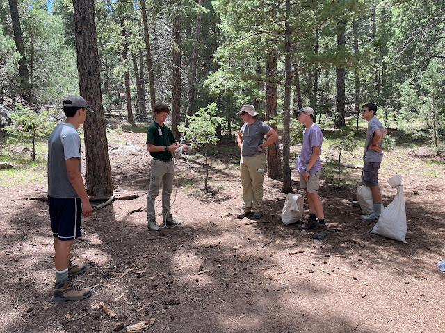 The program for the day was going to be some hatchet throwing at a camp called Clearwater. We all got our day packs with some essentials and started on the hike. After about 2.5 miles of hiking we realized that we had turned the wrong way. It was a hot day and we were all a bit discouraged, but everyone kept a great attitude. We decided to go ahead and grab our lunch before hiking back to camp. One thing we realized was that if we still needed to check in to clearwater. That meant 2.5 miles back to camp and then 5 miles the right way to check in plus 5 miles back to camp afterwards. It was going to be a long afternoon. However on the way back to our camp, in the middle of no where we saw 2 staff surveying a bunch of downed trees from a recent wind storm. I still don't know how our paths crossed on that day, but we thought maybe they could radio in to clearwater and save us all that extra hiking. So we flagged them down and started telling them our story. One of the staff was he would be happy to let clearwater know we missed them due to getting a bit lost and then he started talking more to the boys. After some discussion, the man that had been talking to the boys introduced himself as Roger B Hoyt who is the general manager of all of Philmont! On this huge property in the middle of no where on one hike where we got lost, we bumped into the boss of Philmont. He pulled out two commentative coins from his pack and gave one to our lead advisor and one to our crew leader. We said our goodbyes and gave another thank you for saving us the extra hiking.